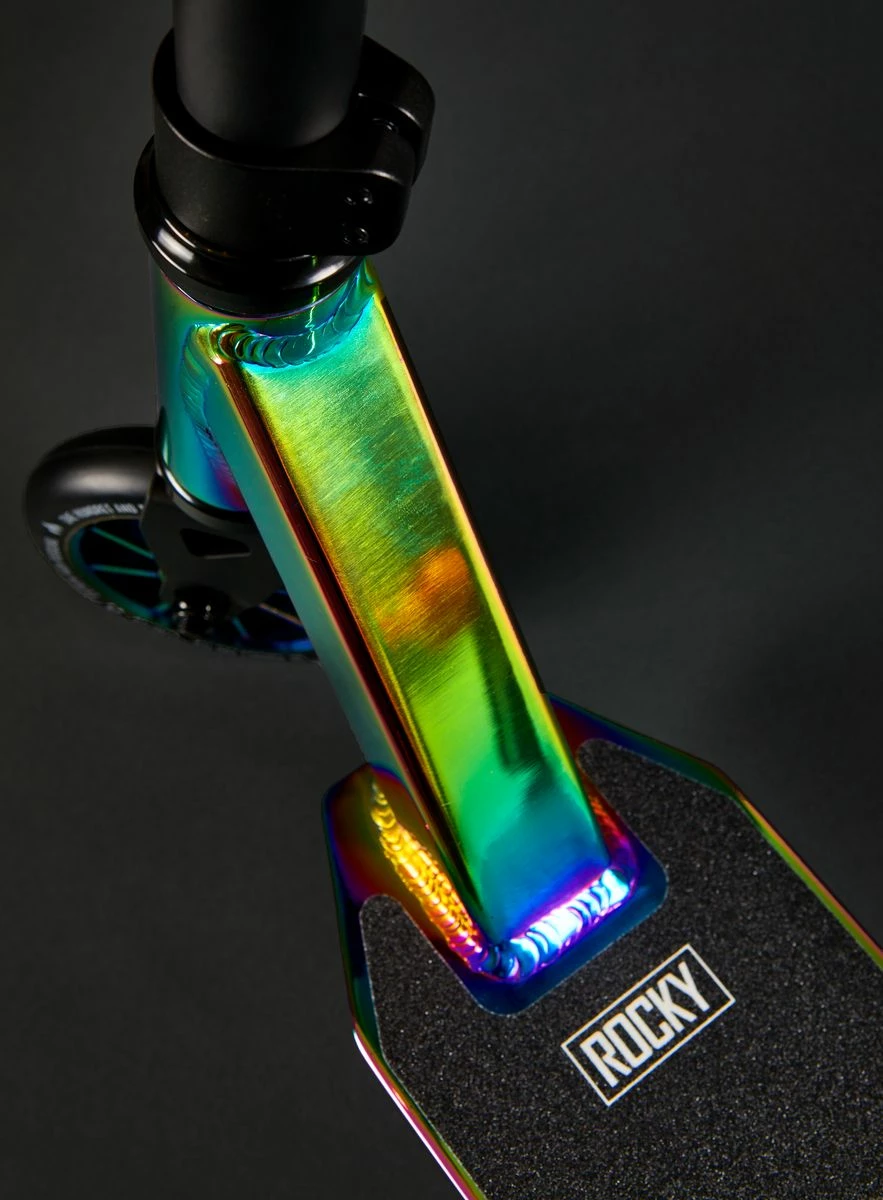 Το νέο Rocky είναι το ιδανικό σκούτερ για κάθε αρχάριο αναβάτη. Ασυναγώνιστο σε αυτό το εύρος τιμής, έχετε τα καλύτερα υλικά και μπορείτε να το πάτε απευθείας στις ράμπες! Το Rocky προσφέρει σε όλους την ευκαιρία να δοκιμάσουν το stunt σκούτερ χωρίς να θυσιάσουν την ποιότητα. Η σανίδα είναι κατασκευασμένη από το καλύτερο 6061 αλουμίνιο, μήκους 50 cm και πλάτους 11,5 cm. Αυτό σας δίνει αρκετό χώρο για να μετακινηθείτε και να έχετε σταθερή βάση. Το τιμόνι είναι κατασκευασμένο από ατσάλι 4130 ChrMo, με ύψος 58 cm και πλάτος 58 cm. Το όμορφο ατσάλινο πιρούνι ολοκληρώνει τον κλασικό σχεδιασμό του σκούτερ. Για συμπίεση, χρησιμοποιούμε ένα universal HIC σε αυτό το μοντέλο για εξοικονόμηση βάρους. Αυτό συμπληρώνεται από τον σφιγκτήρα HIC Aluminium 2 Bolt. Τα loose ball ρουλεμάν χρησιμοποιούνται επίσης ως ρουλεμάν ελέγχου. Το χρώμα που ταιριάζει με τις λαβές με το PU roll είναι επίσης ελκυστικό. Οι ρόδες έχουν διάμετρο 110 mm και ο πυρήνας του κυλίνδρου είναι επίσης κατασκευασμένος από το καλύτερο 6061 αλουμίνιο. Το φρένο Flex είναι κατασκευασμένο από ατσάλι και στηρίζεται από πάνω.