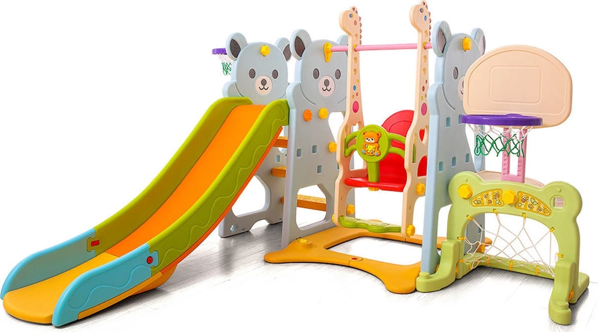 Το σετ αποτελείται από μια τσουλήθρα με ένα καλάθι μπασκετ που είναι προσαρτημένο σε αυτό, μια κούνια και ένα τέρμα ποδοσφαίρου με ένα επιπλέον καλάθι μπάσκετ.