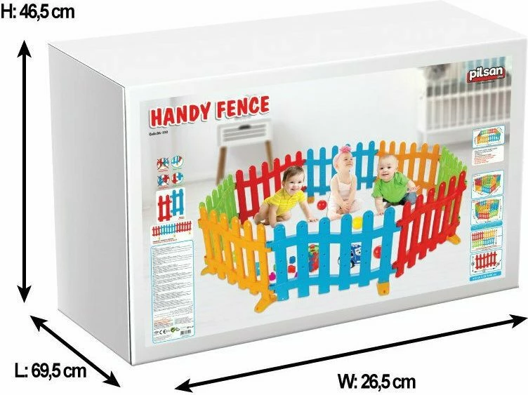 O παιδικός φράχτης Pilsan Handy Fence αποτελείται απο 8 φράχτες και 9 πόδια στερέωσης. Μπορεί να τοποθετηθεί σε διαφορετικές μορφές και μπορεί να χρησιμποιηθεί και ως Ball Pool