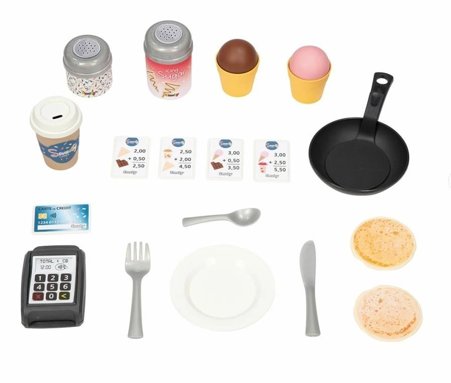 Περιλαμβάνονται 18 αξεσουάρ για να ανανεώσετε τις λειτουργίες: 1 πιάτο, 1 πιρούνι, 1 μαχαίρι, 1 κουτάλι, 1 κούπα με καπάκι, 1 τηγάνι για να αναποδογυρίσετε τηγανίτες, 2 τηγανίτες, 1 κατσαρόλα ζάχαρης, 1 βαζάκι, 2 παγωτά, 4 αποδείξεις ταμείου, 1 συσκευή ανάγνωσης πιστωτικών καρτών και 1 πιστωτική κάρτα.
