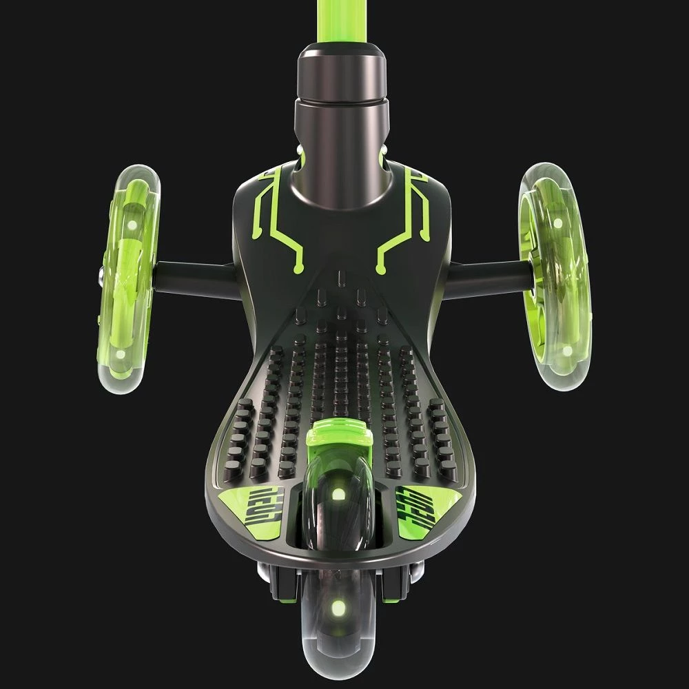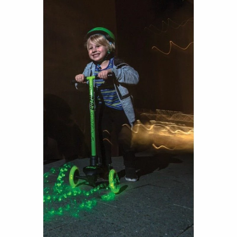Πατίνι Neon Glider από την Υ-Volution, με εντυπωσιακές LED φωτιζόμενες ρόδες. Η λειτουργία αλλαγής κατεύθυνσης ενισχύει την ικανότητά των παιδιών να στρίβουν με ασφάλεια χρησιμοποιώντας το βάρος του σώματός τους, ενώ διαθέτει φαρδιά βάση και οπίσθιο φρένο για την καλύτερη δυνατή επιβράδυνση. Δεν διαθέτει λειτουργία αναδίπλωσης.